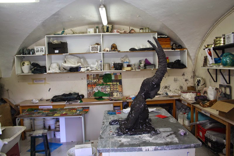 Above are two figures made by one of our year 13 students Diana Vasconcellos. The human figure is Diana, or to be accurate a mod-roc mould of Diana. It is not a cast of Diana, but the mod-roc shell itself. It is a three part mould joined together. When talking about casting in a y12 lesson the other day, I realised most people in the room were slightly confused about what a "cast" is. The other figure you see is a monkey which was built in cardboard and tape (using a similar technique to the year 9 sculptures based on Naum Gabo, posted a few days ago). The surface was then covered in plaster.